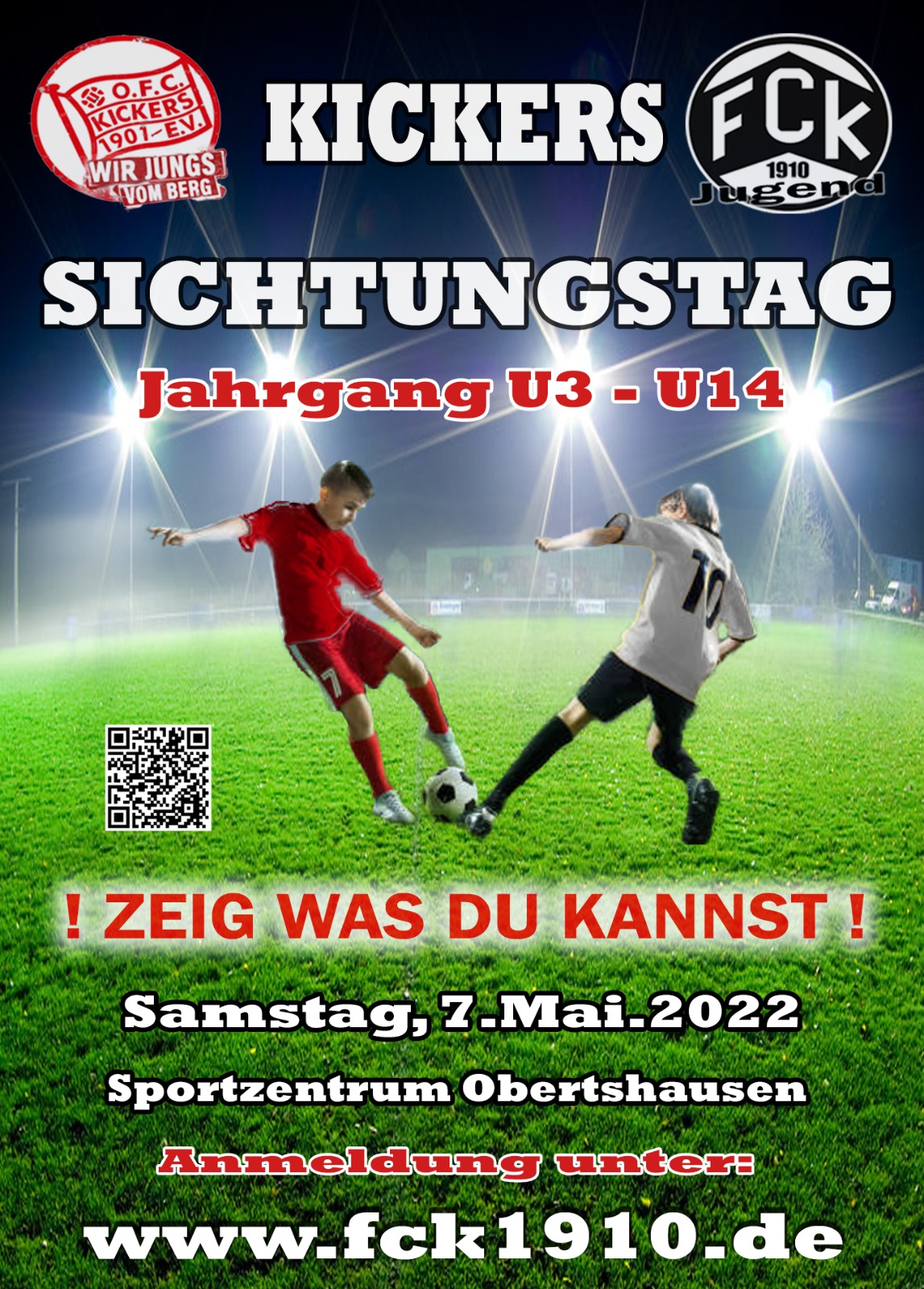 Unter dem Motto “WIR SIND KICKERS” veranstalten Kickers Obertshausen (FCK) und Kickers Offenbach (OFC) einen Sichtungstag für junge Talente aus der Region. An diesem Tag können Nachwuchsfußballer den rund 12 Trainern beider Vereine zeigen, was in ihnen steckt. Ziel ist es, in verschiednen Trainings- und Sichtungseinheiten, den jungen Spielern Perpektiven aufzuzeigen. Grundlage ist auch das gemeinsame Ausbildungskonzept von OFC/ FCK mit Unterstützung, der DFB-Elite-Förderung, einen den Weg zum OFC oder dem hochklassigen Fußball aufzuzeigen.